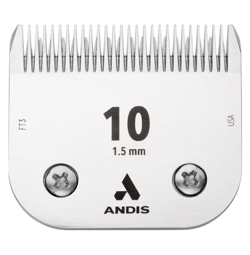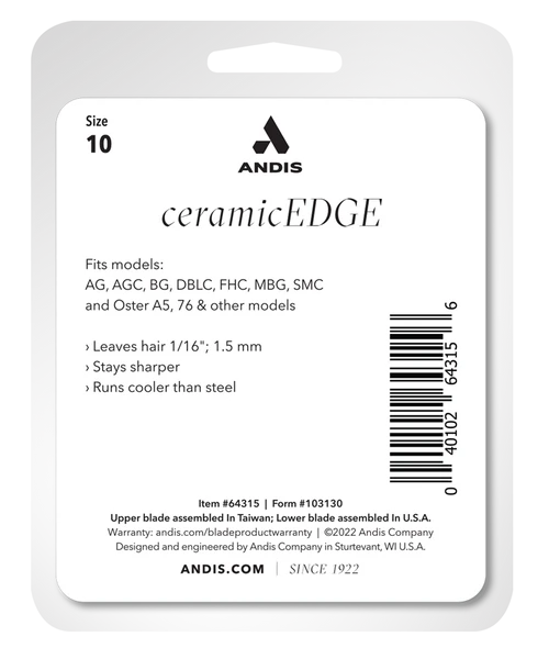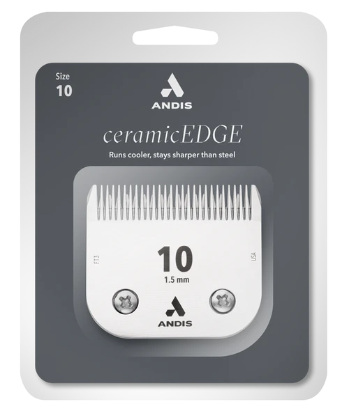 Andis Ceramic Edge Blade System Size 10 leaves hair 1/16 inch (1.5mm). This replacement clipper blade fits Andis Large Animal Clipper models beginning with AG. Ceramic Edge clipper blades feature a certified zirconium oxide ceramic cutter blade that stays sharper longer and runs 75% cooler than steel. Andis model # 64315.