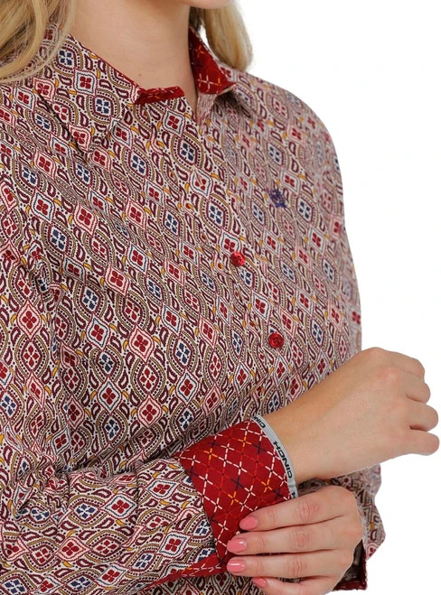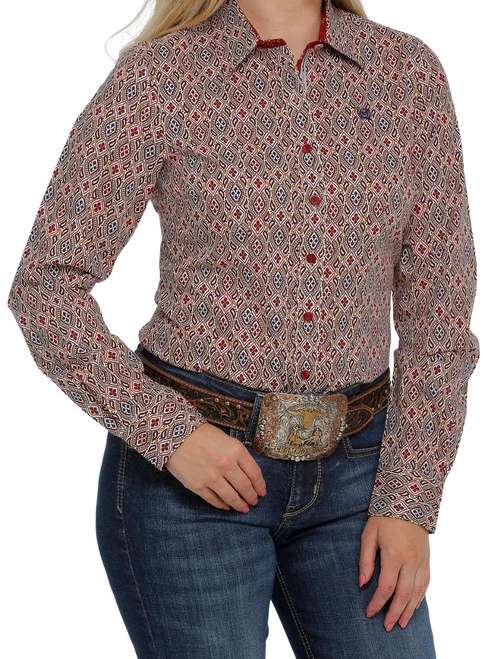 This Cinch Ladies Performance Shirt has a plain front with no pockets for an ultra-clean, crisp profile. The performance cut Western riding shirt has a longer shirt tail and sleeves so you’re always properly covered and comfortable. The all-cotton material has a little bit of give plus a silky feel that will make you think it’s a cotton blend. The prints are beautiful, perfect for horse showing in any season.