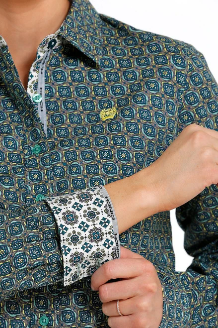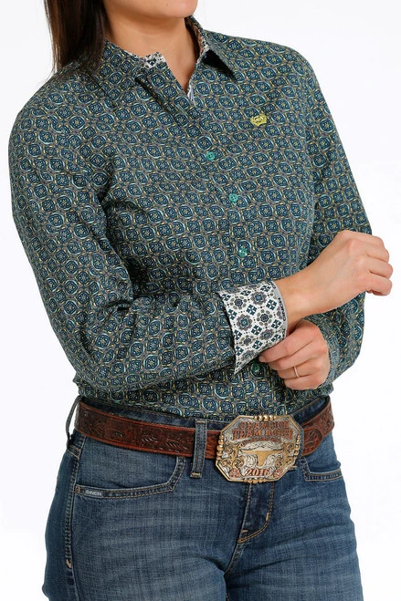 Women’s Cinch Performance Shirt has distinctive prints with contrast print trim on the inside of the collar, inside the cuffs, and the cuff placket. Cinch branded coordinating buttons give it a polished finishing touch. The Cinch Performance Shirt for Western showing and riding has a small embroidered Cinch logo at the chest. The collar is taped so there are no seam edges to irritate. The button front shirt has bust darts plus princess seams in front and back to enhance the feminine shape. Wear your Cinch Performance Shirt at the shows or for clinics or lessons. It always looks sharp!
