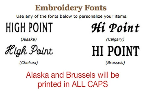 - Which FONT style – Please note that Brussels and Alaska fonts will be embroidered in ALL CAPITAL LETTERS.