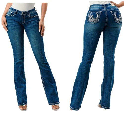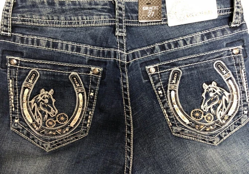 Grace in LA Horseshoe Pocket Jeans are tastefully embellished with small crystals, embroidery, and metallic thread and feature the perfect amount of sanding and whiskers. Ladies bootcut denim jeans have a zip fly and button front with classic 5-pocket styling. The back pockets are a standout with fancy horseshoe design framing a pretty horse head. The 34″ length of the Grace in LA Easy Fit Horseshoe Pocket Jeans make them perfect for wearing with boots or heels.