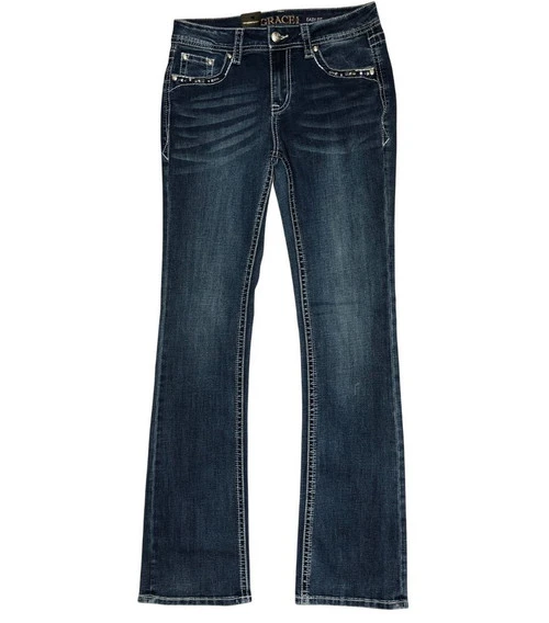 Grace in LA Easy Fit Horseshoe Pocket Jeans for women have sophisticated flair and a light, stretchy feel. These flattering Easy Fit mid-rise jeans from Grace in LA are a classic bootcut style with wonderful embellishment on the pockets. The Horseshoe Pocket Jeans have a higher rise and a bit of spandex for a comfortable fit.