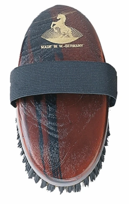 The HAAS Mustang brush mixes synthetic bristles with special fine brass wire, a combination unique to the Haas Damen Mustang. This special combination of bristles is ideal for cleaning thick or shedding coats. Not recommended for use on sensitive-skinned horses. Wooden base brush with convenient elastic hand hold. The Haas Mustang’s smalller “ladies” size measure 200mm x 85mm. Made in Germany.