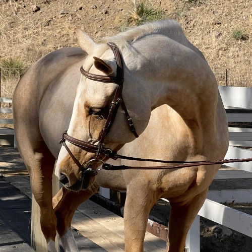 Halter Ego Halifax Hunter Bridle has an anatomical crownpiece to disperse pressure and fit comfortably around the ears. It has a crank noseband, removable flash, and hook and stud closures. The rich brown leather, white stitching, and brass hardware create a timeless look for showing or riding. Halter Ego Halifax Hunter Bridle does not come with reins. Mary’s Tack has a huge selection of reins, so you can pick just the pair you need to go with this handsome bridle.