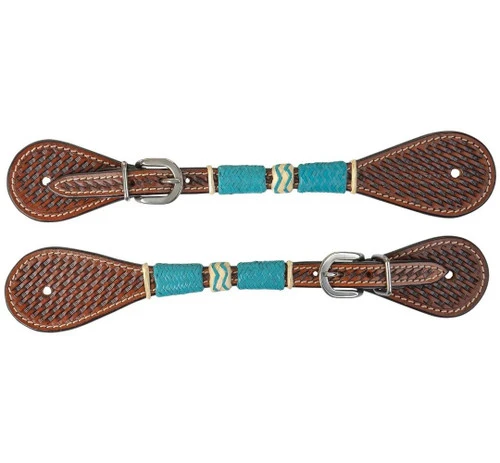 Circle Y Turquoise Round Up Spur Strap in Ladies/Youth size is extra stylish with basketweave tooling and turquoise and natural rawhide buttons on Regular Oil leather. are definitely a winning combination from Circle Y!