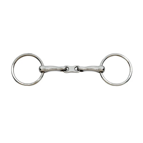 Ovation Curved French Link Loose Ring Snaffle Bit. The curved mouthpiece design provides maximum comfort and top performance by allowing room for the tongue and reducing pinching in the mouth. The French link center piece allows targeted tongue pressure when needed for clear communication between rider and horse. This bit from Ovation comes in Sizes: 4.5, 5, 5.5. If you are not sure if this is the right bit for your horse, Mary’s lets you try it out for a small fee!