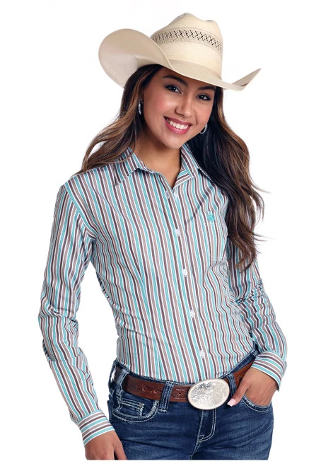 Ladies Aqua Brown Stripe Western shirt is all cotton for cool, breathable comfort. The tapered silhouette and structured fit make it a nice look for showing. Really nice mix of colors for the print! Panhandle Rough Stock Aqua Brown Stripe Shirt has the look and comfort for season-spanning value. Nice shirt for layering when the temperature dips again.