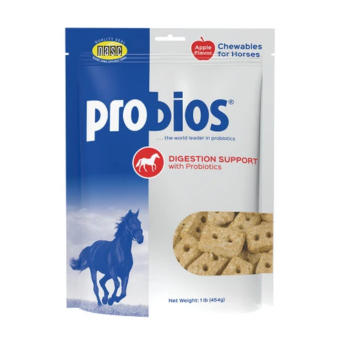 Probios Horse Digestion Support Treats in a chewable cookie are the easiest way to give your horse probiotics. The apple flavored Digestion Support Treats deliver beneficial bacteria that help maintain proper gut function and appetite. Horses can easily develop digestion issues when under stress. A change in training, routines, and environment plus the rigors of competition can lead to diarrhea or loss of appetite. Probios Equine Digestion Support Treats have probiotics in a delicious treat that your horse will appreciate.