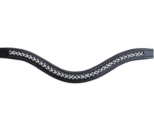 Sophisticated and classic pearl stones on black leather are distinctive and attractive for competition and clinics. The Red Barn Pearl Curved Browband is easy to switch with the regular browband on most bridles.