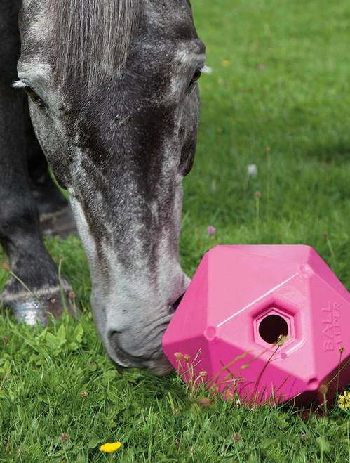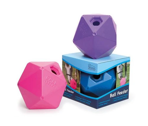 Shires Ball Feeder for horses is a sturdy plastic ball to fill with treats. Horses love to play with the angled Ball Feeder because if they roll it around enough, they’ll get a reward. Great for horses that tend to get bored and look to get into mischief. The Ball Feeder from Shires Equestrian will capture a horse’s interest, especially if they are food motivated! In Pink, Blue, or Purple. Measures 9 inches.